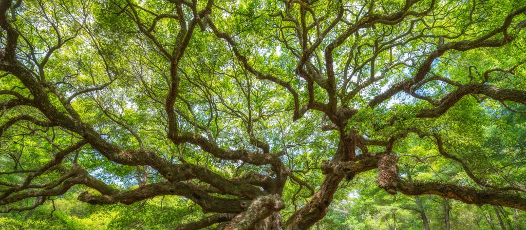 Feuillage vert flou et lumière du soleil se reflétant sur une eau calme, avec des rayons de lumière visibles et des effets de bokeh doux.