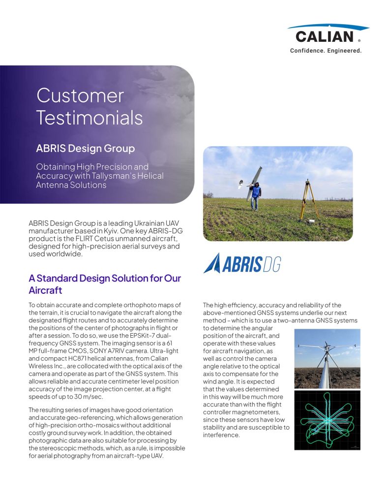 Download our case study to see how ABRIS Design Group enhanced UAV accuracy and reliability with Calian’s HC871 helical antennas. Learn about the technology behind the FLIRT Cetus unmanned aircraft and its impact on high-precision aerial surveys.